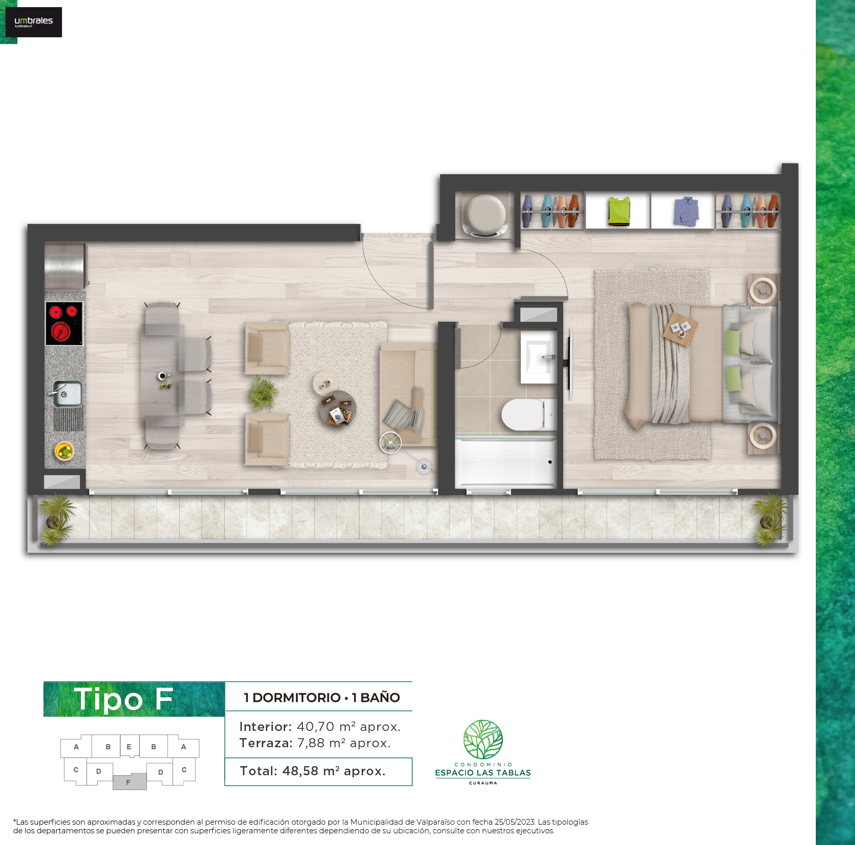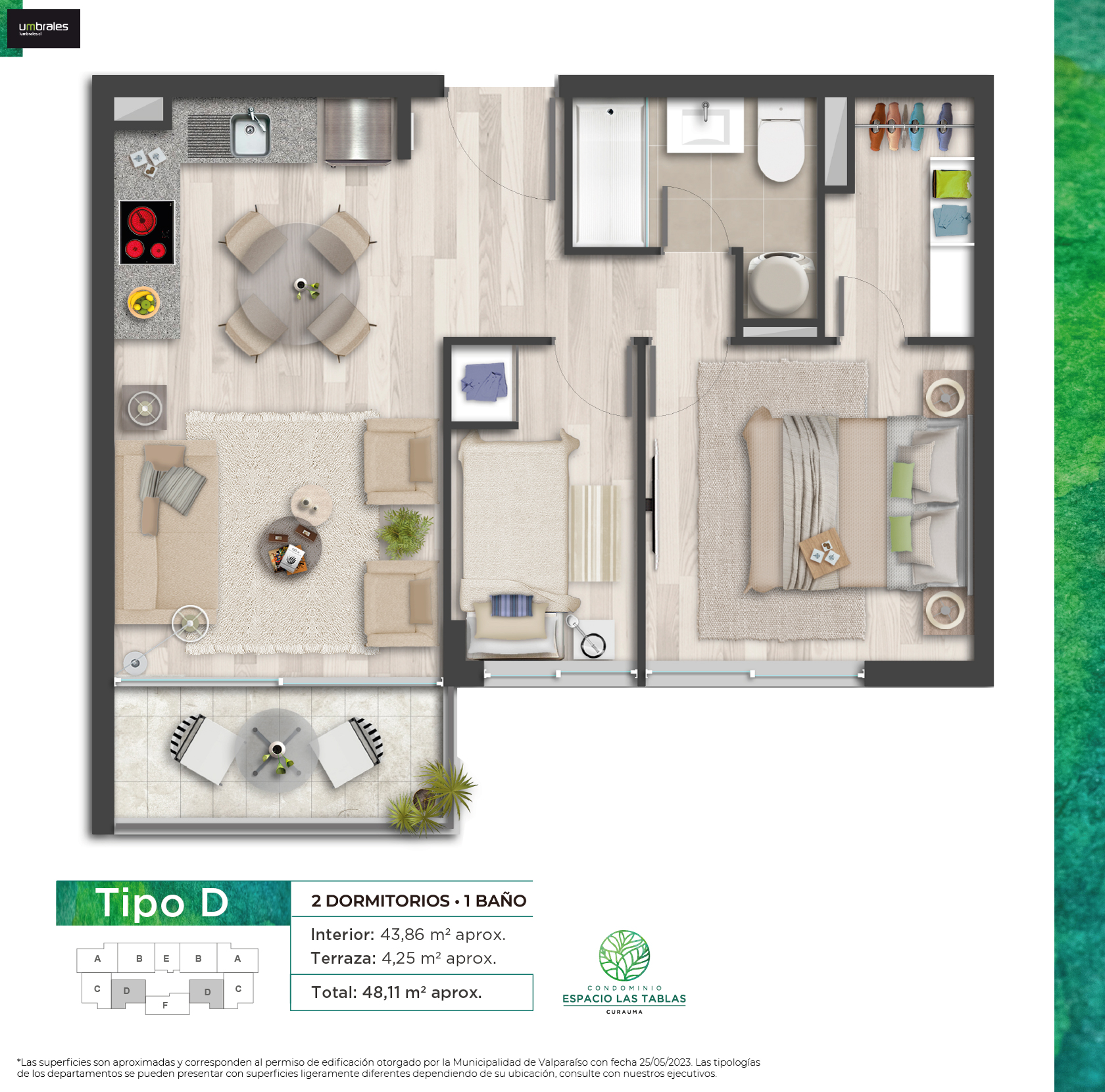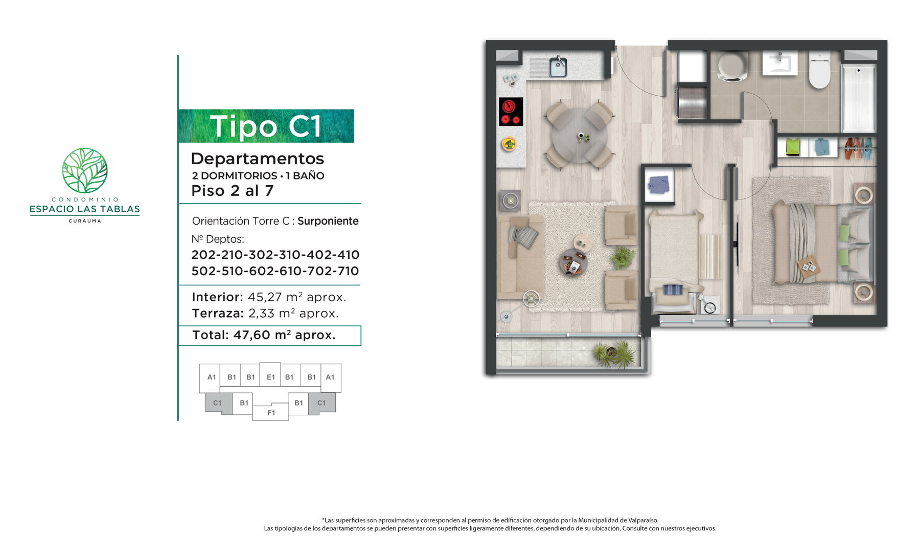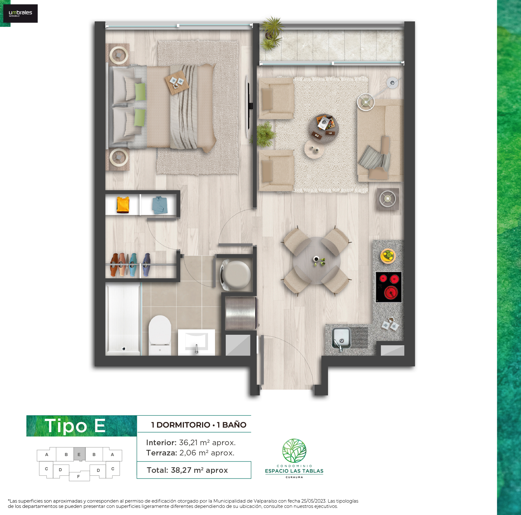 modernos departamentos, y se ubica en el corazón del mejor sector de Curauma, a sólo minutos del Embalse de la Luz, servicios, comercio y educación. El proyecto cuenta con edificios de sólo 7 pisos y departamentos con superficies que van desde los 38 m2 hasta los 60 m2 totales. El proyecto cuenta con un terreno de más de 2 hectáreas rodeado de naturaleza, espacios comunes y seguridad con accesos controlados. |